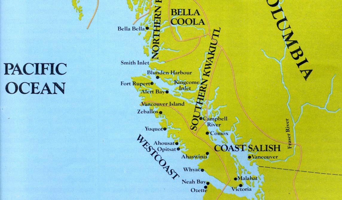 Die Kwakiutl lebten in Blockhüttendörfern in den Regenwäldern aus Zedern und Tannen unmittelbar an der Küste. Sie fischten und jagten in riesigen Einbäumen entlang der inselreichen Buchten und Fjorde von Vancouver Island. Stets eifrig darauf bedacht, Händler anzulocken, machten sie ihre Dörfer dadurch auffällig, dass sie am Strand die riesigen geschnitzten Baumstämme errichteten, die wir fälschlich als „Totempfähle" bezeichnen. Die Schnitzereien an diesen Baumstämmen symbolisierten die Titel, auf die der jeweilige Häuptling des Dorfes kraft Abstammung Anspruch erhob.